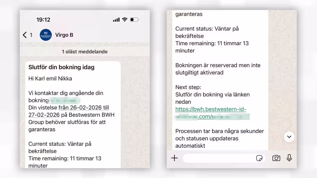 Meddelandet kommer från en användare som använder Best Westerns logotyp. Meddelandet informerar om att bokningen ännu inte är slutförd och innehåller specifika detaljer om personens bokning (kontaktuppgifter, datum m.m.). För att bokningen inte ska annulleras uppmanas mottagaren att bekräfta betalningsuppgifter via en särskild länk.