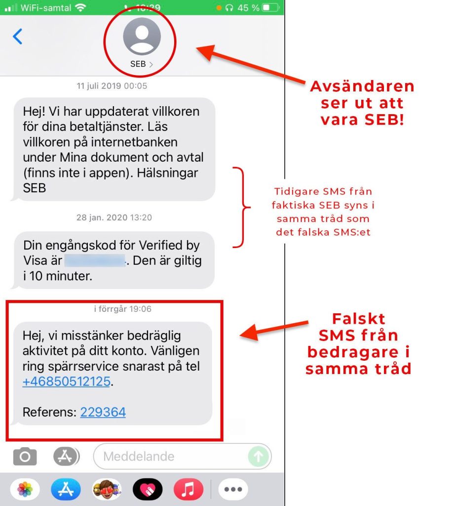 Observera att avsändaren ser ut att vara SEB. Bedragarna använder särskilda program för att förfalska avsändaren, i vissa fall syns till och med tidigare meddelanden som skickats från faktiska SEB (se ovan)! Bedrägeriet är genomarbetat och bedragarna har bland annat sett till så att telefonnumret har taggats som “SEB spärrservice” på söksidor som hitta.se. Allt fler har dock anmält telefonnumret som bedrägeri vilket hitta.se har uppmärksammat.