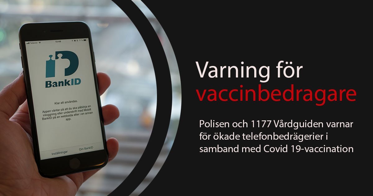 I samband med vaccinationsprogrammen för Covid-19 varnar nu både Vårdguiden 1177 och Polisen för ökade bedrägerier i samband med vaccinationen. Polisen har tidigare gått ut med en varning angående den här typen av bedrägeri och uppger att man har sett en markant ökning sedan januari. Den försenade vaccinationsprocessen har gjort att en stor del av befolkningen fortfarande väntar på sin första dos vaccin och många är särskilt sårbara under rådande situation. Senast idag rapporterade Sveriges Television om Guy som blivit uppringd angående en vaccinationstid och ombedd att identifiera sig med Bank-ID. Minuter senare var hans bankkonto tömt på pengar. Som tur var reagerade Guy i tid och kontaktade sin bank som kunde stoppa överföringen.